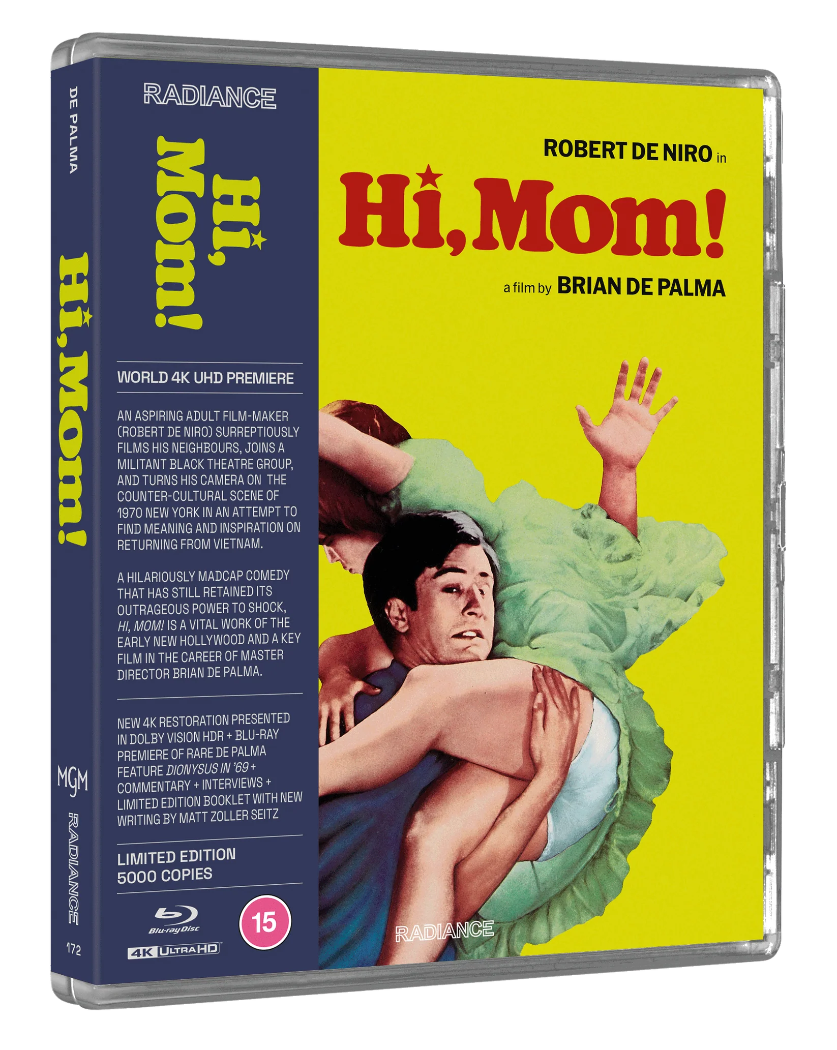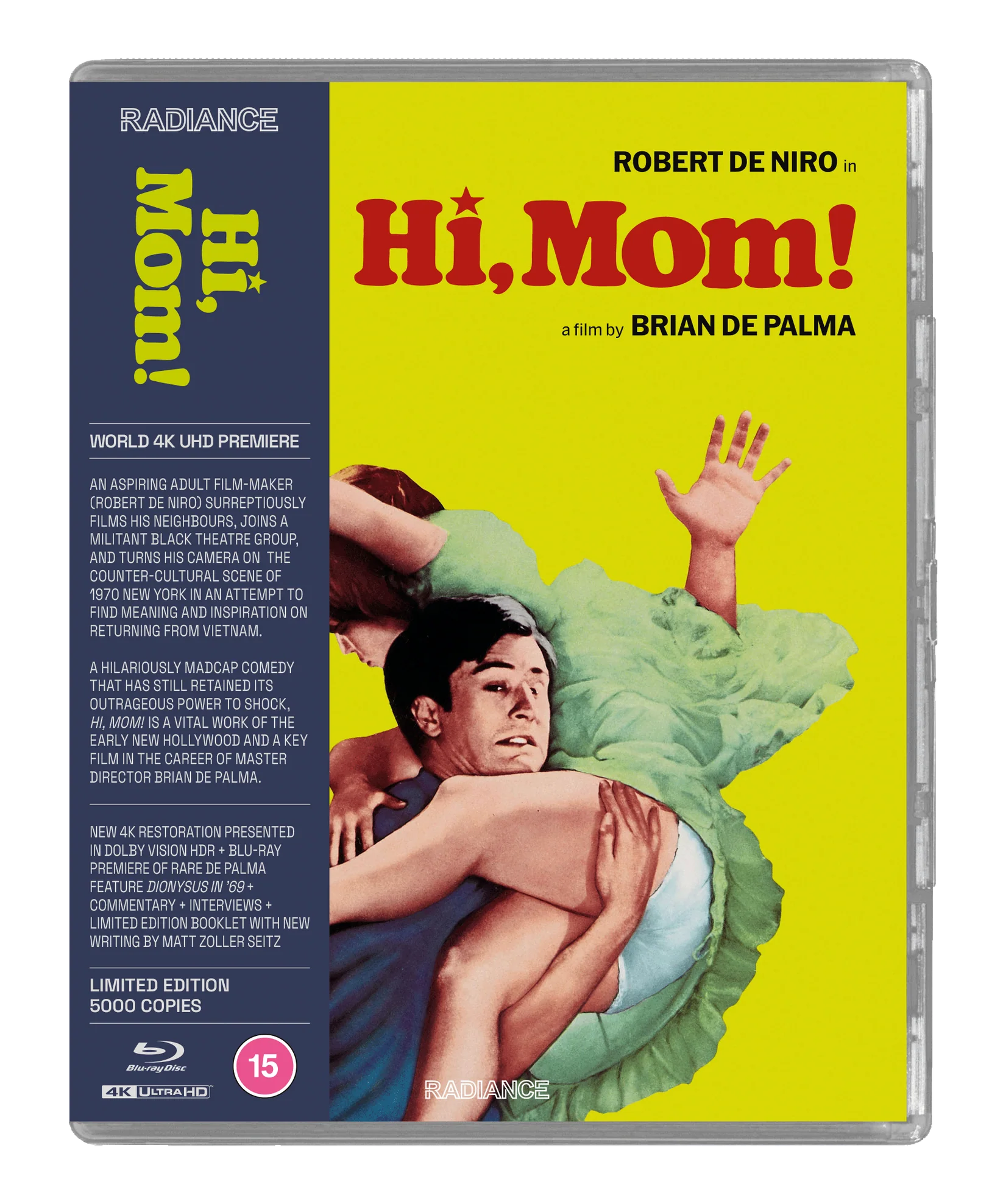 Aspiring adult film-maker Jon Rubin (Robert De Niro, Taxi Driver) returns from a tour of Vietnam and, armed with his film camera, attempts to find meaning and inspiration in the counter-culture of New York in 1970. Rubin graduates from surreptitiously filming his neighbours, to joining a militant Black experimental theatre group, before flirting with full-scale domestic terrorism, in this hilariously madcap satire that has still retained its outrageous power to shock, fifty years after initially stunning American audiences. Making its world premiere on 4K UHD, Hi, Mom! is a vital work of the early New Hollywood, and a key work in the career of master director Brian De Palma.