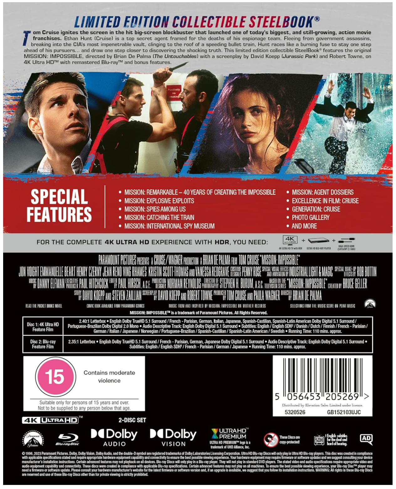 Tom Cruise ignites the screen in the hit big-screen blockbuster that launched one of today’s biggest, and still-growing, action movie franchises. Ethan Hunt (Cruise) is a top secret agent framed for the deaths of his espionage team. Fleeing from government assassins, breaking into the CIA’s most impenetrable vault, clinging to the roof of a speeding bullet train, Hunt races like a burning fuse to stay one step ahead of his pursuers... and draw one step closer to discovering the shocking truth. This limited edition collectible SteelBook® features the original MISSION: IMPOSSIBLE, directed by Brian De Palma (The Untouchables) with a screenplay by David Koepp (Jurassic Park) and Robert Towne, on 4K Ultra HD™ with remastered Blu-ray™ and bonus features.