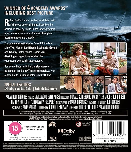 Robert Redford made his directorial debut with this beloved powerful drama. Based on the acclaimed novel by Judith Guest, Ordinary People is an intense examination of a family being torn apart by tension and tragedy.The top-notch cast includes Donald Sutherland, Mary Tyler Moore, Judd Hirsch, Elizabeth McGovern, and Timothy Hutton, whose Oscar® win (Best Supporting Actor) made him the youngest to ever win in that category. Remastered from a 4K film transfer overseen by Redford, this Blu-ray™ features interviews with author Judith Guest and actor Timothy Hutton.