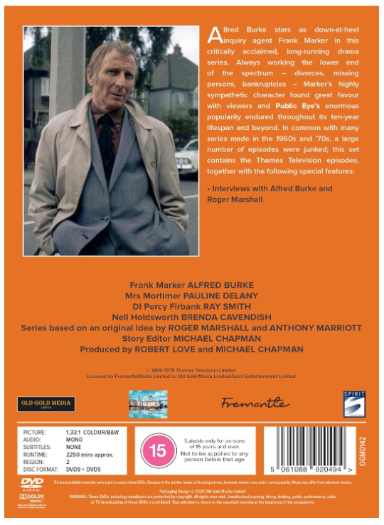 Alfred Burke stars as down-at-heel inquiry agent Frank Marker in this critically acclaimed, long-running drama series. Always working the lower end of the spectrum – divorces, missing persons, bankruptcies – Marker’s highly sympathetic character found great favour with viewers and Public Eye’s enormous popularity endured throughout its ten-year lifespan and beyond.